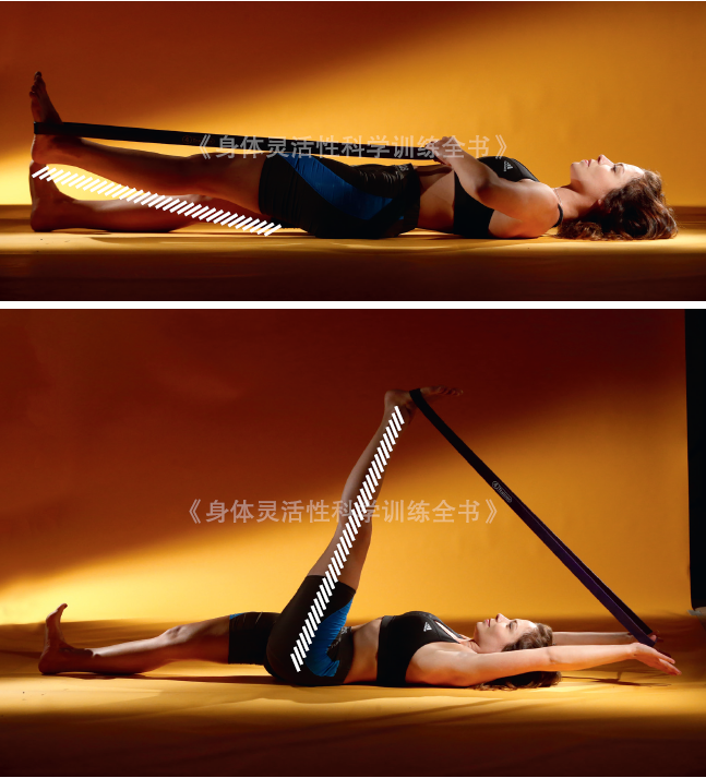 双腿伸直仰卧,一只脚踩在弹力带上,然后快速拉伸弹力带,抬高和降低腿部,保持较快的速度,并逐渐增加拉伸的幅度。