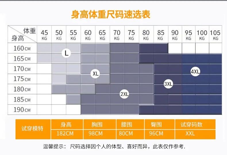 不同身高体重的人都能找到合适的尺寸