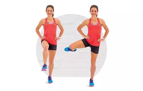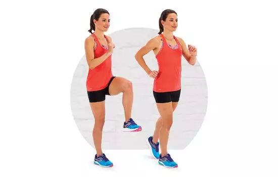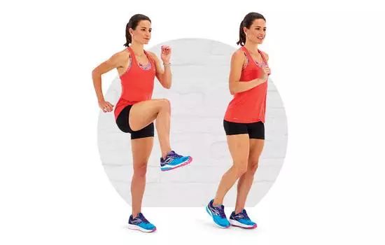 手臂保持跑步姿势(位置),核心用力挺直,做高抬腿,将右膝尽可能高的向上抬。放下还原重复(只做右腿)。