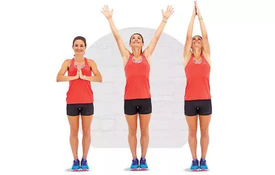 双手上举,在头上十指交握。快速下蹲,同时向下摆动手臂。立起还原,手臂摆动回头上。