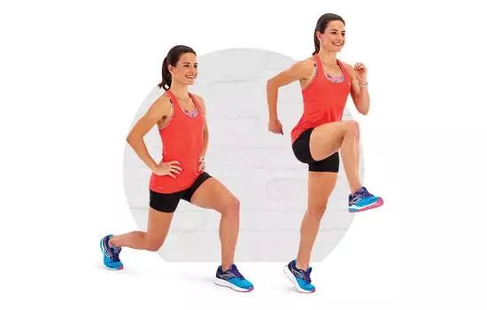 抬起右膝,使其向前伸展,尽量模仿跑步动作。放下右腿,稍弯曲,用右脚前脚掌做蹬地状。