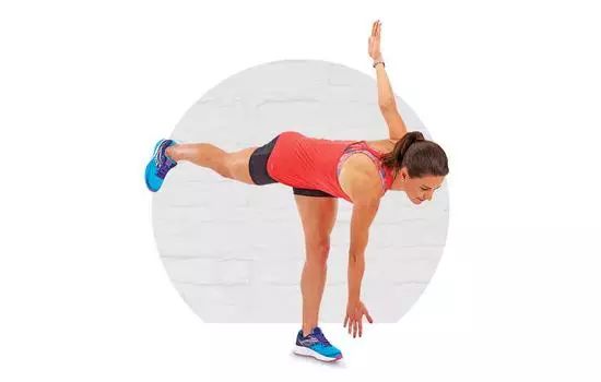 左腿立于地保持平衡,身体向前倾并向后伸直右腿(类似燕式平衡)。转动躯干,尽量使你的右手摸到左脚。