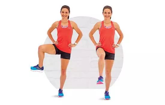 双腿深蹲,然后快速使右膝提高到体侧尽可能高的位置。将右腿还原,再做另一边。