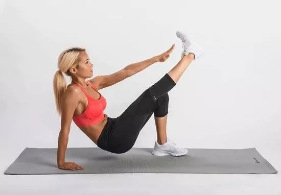 坐在地面上,双手放在身后位于肩膀下方,然后将臀部离开地面,并同时抬起右手和左脚,将它们尽可能快的接触到。