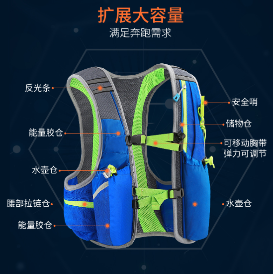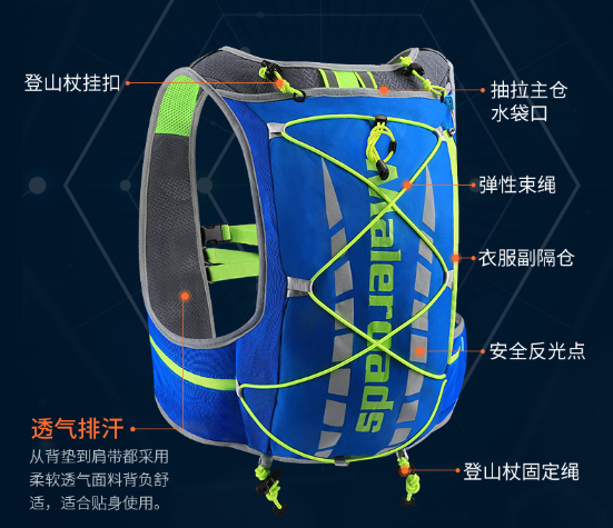 四面弹性材质配合溶解线,线性屈伸技术,让你的背包与你更为合体,更为轻量!十分适合中长距离马拉松越野跑!