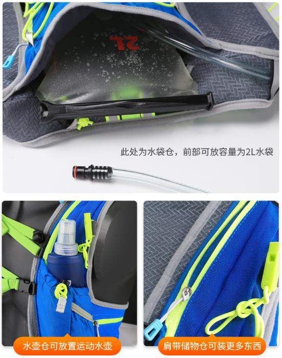 选配2L水袋,同时配置收纳250*2的水壶套,满足你的基本补水需求。内附水袋隔层和固定扣,帮助固定吸管,快速补水,节约比赛过程中的一切时间!