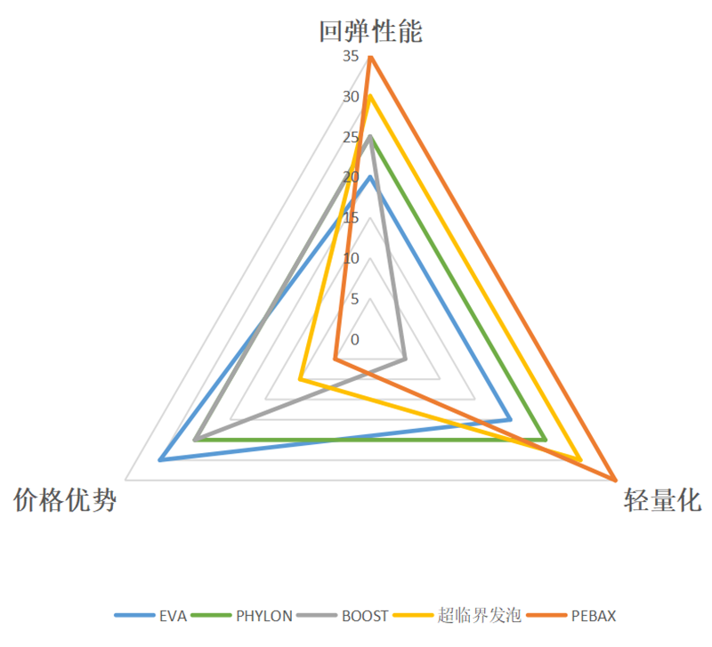 根据目前跑鞋中底材料的研发,中底材料有一下几种: