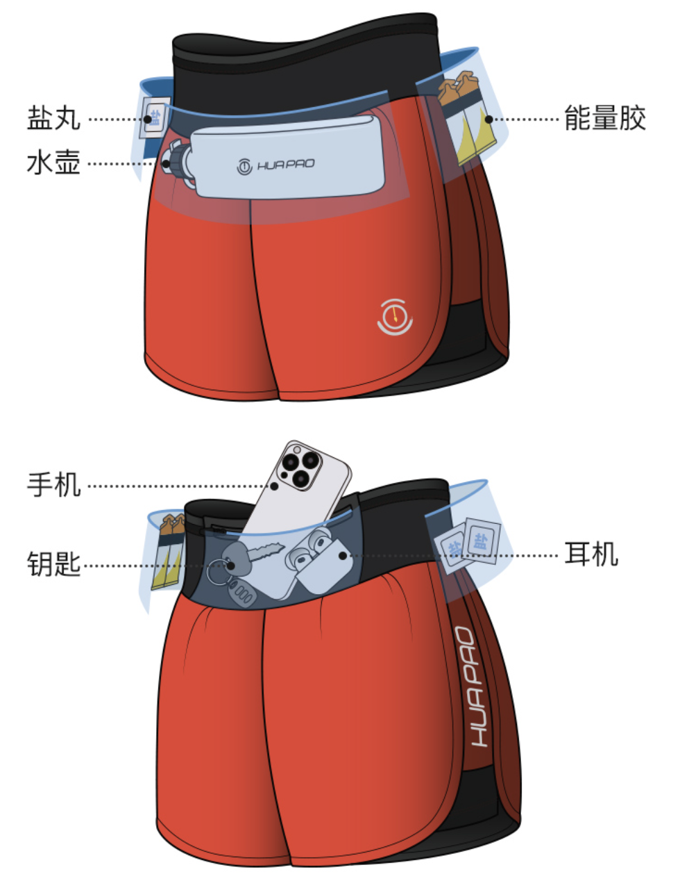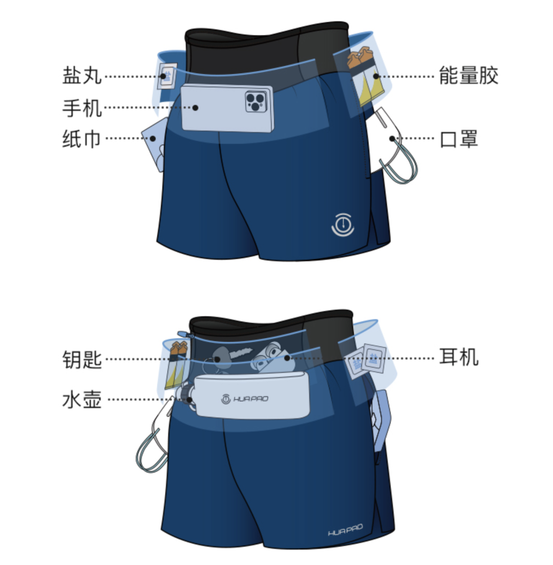 出门跑步,像钥匙啊、水啊、手机这些必带产品,用腰包装的话,就是多个负担。而画跑的运动短裤正好解决了这个烦恼!