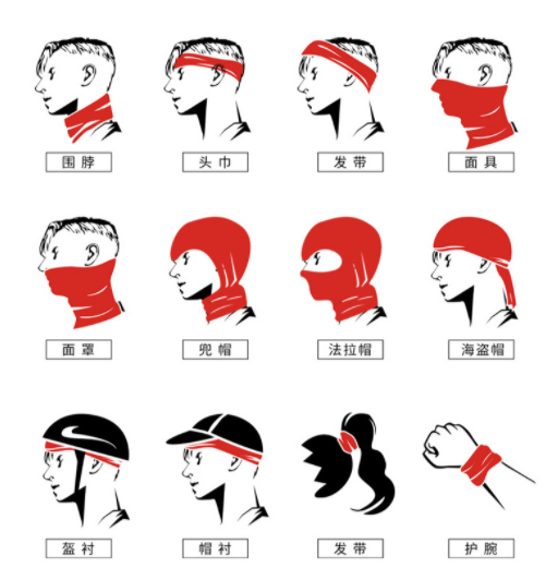 骑行头巾的面料品种非常多,但必须满足弹力和吸汗的基本功能。弹力决定了头巾的适应能力,吸汗功能测试在户外运动中,大家对头巾的基本要求。通过简单的折叠,拉伸,头巾会变成各种造型,来满足大家的需求,成为骑行的辅助。