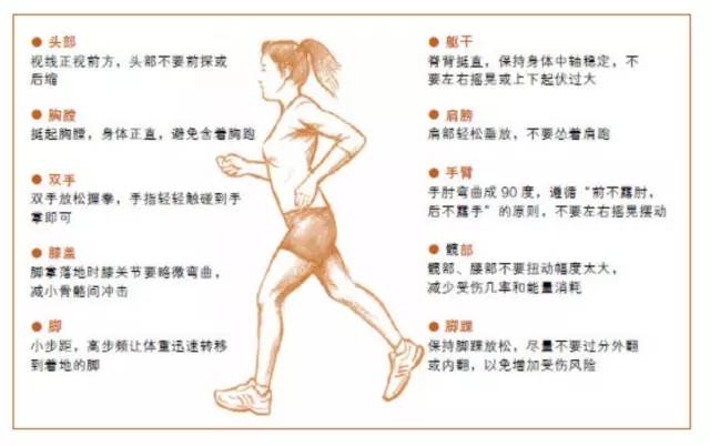 头部、脖子和背部保持一条直线,双眼平视前方,使颈椎和背部均衡受力。臀部和背部保持一条直线,臀部是身体力量的中心,跑步时背部挺直,臀部会给身体一个持续向前的动力。如果跑步中向前弯腰或者身体过于前倾,会造成骨盆前倾,这会给后背下部造成压力,时间长了会对腰部和背部造成伤害。脚尖和膝盖一条直线,切忌内外八字,这种跑步方式使得膝盖和脚尖不能保持在同一个方向上,加重膝关节的负担,长期下来容易造成膝关节等部位的损伤。摆动手臂时,双肩保持水平,肌肉放松,自然下垂,胳膊自然微屈,双手半握拳,手臂应随步伐尽量前后摆动。许多人跑累了以后就会不自觉的耸起双肩,这会造成肩膀肌肉紧张,产生肌肉劳损,正确的放松方法是晃一晃肩膀,保持肩膀放松。3、抬腿要适度,应选择合适的步幅,尽量做到每脚都落在身体的正下方。许多初学者总喜欢增加步幅来提高锻炼效果,其实增大步幅并不等于增加锻炼强度,只会造成双腿腾空时间长、重心起伏大、落地力量重,久而久之会带来不必要的伤害。因此不能一味的追求步幅和频率。应用脚后跟和脚中部落地,然后向前转换,前脚掌蹬地离开地面。最常见的错误落地方式是全脚掌着地,由于落地时没有缓冲,对身体的冲击性增大,在较硬的地面上跑步时尤甚。通常慢跑的呼吸节奏是每2~3步一呼,每2~3步一吸,并尽量用鼻呼吸,保持呼吸均匀和深度一致。当跑步时间较长或速度加快时,用口和鼻同时配合呼吸,正确的方式是是口微张,轻咬牙,舌尖卷起,微微抵住上腭,让空气从牙缝中进出。呼吸时,要注意做到呼吸均匀而又有节奏,吸气要缓慢均匀,呼气要短促有力,适当调整深度。当身体出现明显的疲劳症状时,需要放慢速度调整呼吸。1、许多跑步者在畅快的跑完步后,总是想马上坐下或者躺下休息一会儿,也会大口喝水补充水分,这都是不正确的。跑完步最需要做的是什么?休息?喝水?都不是。而是拉伸。跑步后的拉伸运动能够将跑步的效果最大化,许多姑娘总在抱怨跑步使得小腿越来越健硕,就是因为跑步后没有充分拉伸。拉伸时,需要对膝盖、小腿部、腹部、韧带、臀部等进行一一拉伸。在心跳趋缓后再坐下休息,然后饮用淡盐水,也可食用适量水果来补充跑步时消耗的能量。3、如果在跑步中已经出现受伤症状,应立即停止运动。脚踝部扭伤,先小幅度的动一动患处,如果疼痛感较小,建议先进行冰敷,减小肿胀;如果疼的十分厉害应立马就医。肌肉或韧带的拉伤和扭伤,应马上进行包扎,24小时内千万别揉、按摩或用药,进行冷敷,24小时后再进行按摩热敷和外敷用药。若情况严重应马上就医。在受伤期间一定要减少运动,多休息为好。出现岔气的症状时,应减缓步伐,放慢跑步速度,用正确的呼吸方式进行调整,不宜用手按压患处。俗话说,伤筋动骨一百天,再好的治疗措施和恢复手段都会使身体受到伤害,所以,在跑步时应尽量避免受伤。因此,小编又要再唠叨一句:跑前热身、正确的姿势、跑后拉伸。牢记这三点,预防跑步伤病,才能在跑步中享受更多的乐趣。