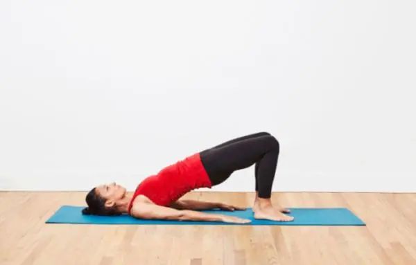 平躺在地面,双臂自然放在身体两侧,双膝弯曲,双脚位于膝盖的正下方。然后核心发力将臀部向上抬起,直到从膝盖到胸部在一个平面内。然后再缓慢的恢复原始姿势。连续做6-8次。