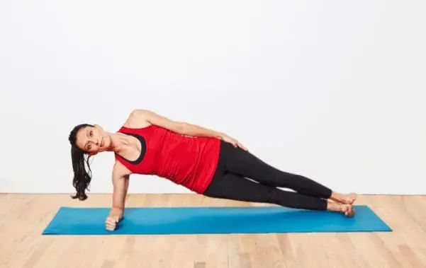 先以右侧身体躺在地面,右臂支撑着身体,右肘位于肩膀的正下方。然后将臀部向上抬起,身体成一条直线,此时只有右臂和右脚接触到地面。完成6-8次之后,换左侧身体练习。