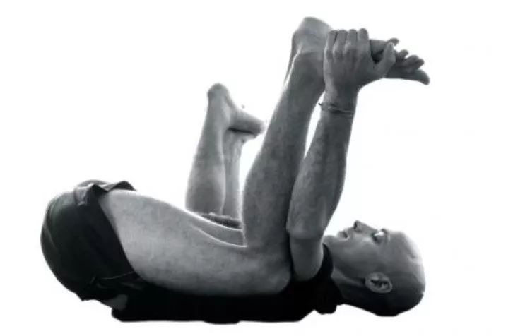 步骤2:膝盖弯曲,双腿移向胸部,臀部抬起,双手扶住腰背。