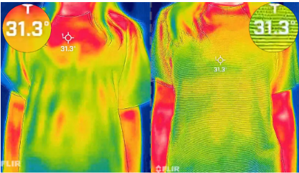 口说无凭,眼见为实。分别穿着x-binc T恤和普通棉T进行运动后的温度测试。 运动前,身上的温度是31.3℃。