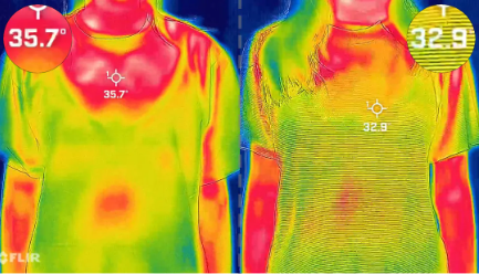 15秒后,身穿普通棉T的温度升高4.4℃,而穿x-bnic T恤的温度才上涨1.6℃。剧烈运动下,升温速度这么慢,可见是凉感纤维在发挥作用!